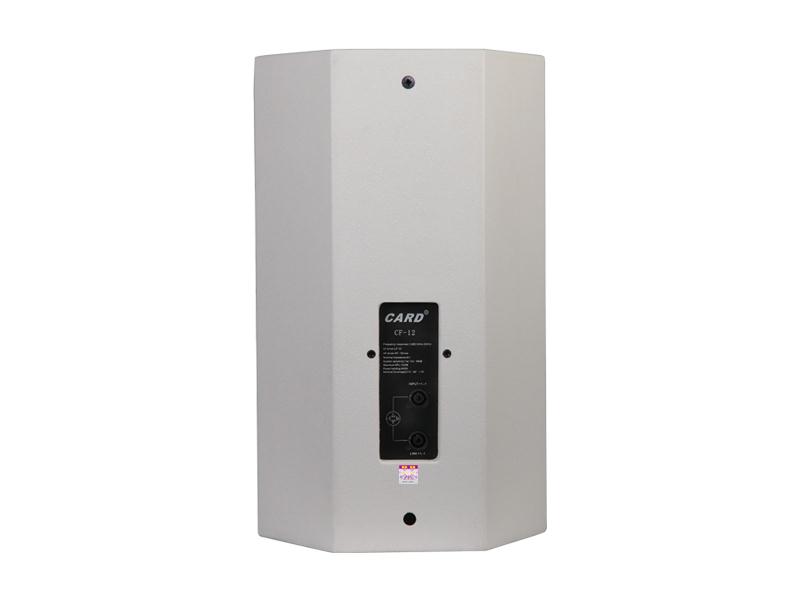 CF-12是一款全频多用途两分频扬声器,水平覆盖有宽角(W型)和窄角(L型)两种。可应用于固定安装、厅堂扩声、流动演出以及大型扩声系统的辅助补声等等。经过CMD覆盖匹配设计的高频号角与低频单元的覆盖特性实现了平顺的过渡与号角连接的高频驱动单元是一个频响平滑宽广的2”喉管(2.5”音圈振膜)的精密高频压缩驱动器。低频扬声器为12”纸盆(3”音圈口径)的精密低频单元。